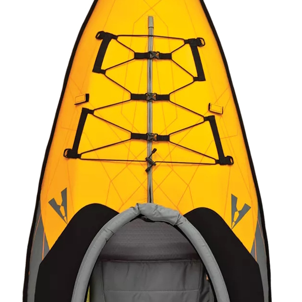 Nella parte anteriore del kayak, una robusta rete porta oggetti offre un'ulteriore option per tenere i tuoi oggetti a portata di mano. Perfetta per gli oggetti a cui devi accedere rapidamente, questa rete è stata progettata per mantenere i tuoi effetti personali al loro posto, anche quando sei in navigazione.