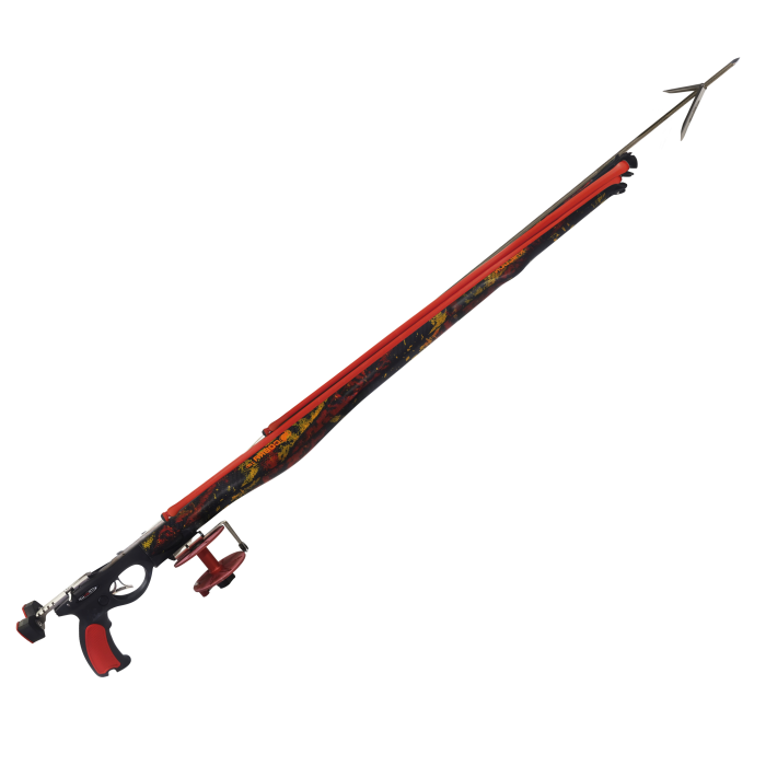 Fucile sub - Fusto monoblocco Camo - Doppio osso di seppia - Estrema manovrabilità e stabilità - Meccanismo integrale in acciaio inox 316 L - Testata aperta - Doppio Elastico di Ø 14 mm firestorm - Asta di Ø 6,5 mm a pinnette corte - Ogiva in dyneema - Mulinello Elysium anodizzato vuoto
