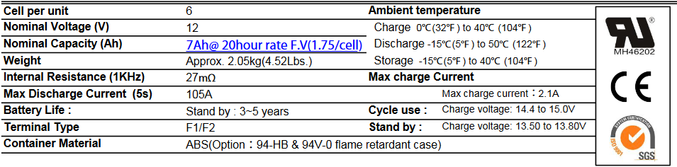| Amperaggio | 7 AH |