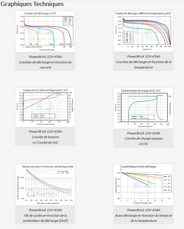 La batteria al litio PowerBrick + 12V-45Ah ha una tensione nominale di 12,8V. Può essere facilmente assemblato in serie (fino a 4 batterie in serie) e in parallelo (fino a 10 batterie).