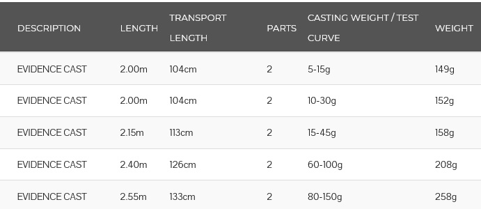 Sviluppato per offrire tutte le caratteristiche della perfetta Canna da pesca moderna , ogni Evidence Canna da pesca è composta dalla più alta qualità e dai più moderni componenti disponibili per realizzare una Canna da pesca. Un blank ultra-veloce in carbonio ad alto modulo, equipaggiato con gli ultimi SeaGuide K-ring e SeaGuide porta-mulinello, il tutto bilanciato con un solo obiettivo in mente
