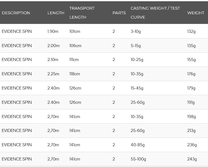 Sviluppato per offrire tutte le caratteristiche della perfetta Canna da pesca moderna , ogni Evidence Canna da pesca è composta dalla più alta qualità e dai più moderni componenti disponibili per realizzare una Canna da pesca. Un blank ultra-veloce in carbonio ad alto modulo, equipaggiato con gli ultimi SeaGuide K-ring e SeaGuide porta-mulinello, il tutto bilanciato con un solo obiettivo in mente