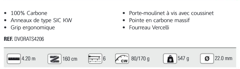 100% carbonio. Anelli tipo SIC KW. Impugnatura ergonomica. Porta-mulinello a vite con cuscinetto. Punta in carbonio solido. Fodero vercellese.