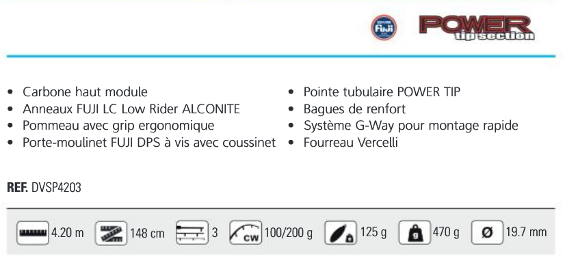 Lunghezza 420 cm - Potenza 100/200 gr - Innesti 3 sezioni - Blank carbonio ad alto modulo