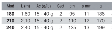 Lunghezza 180 a 240 cm - Potenza 15 a 40 gr - Innesti 2 sezioni - Blank carbonio