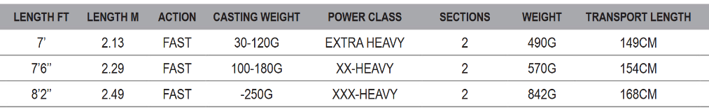 da 213 a 249 cm • Potenza da 30 a 250 gr • Innesti del tallone • Blank: Powerlux 1000 carbon + X Wrap