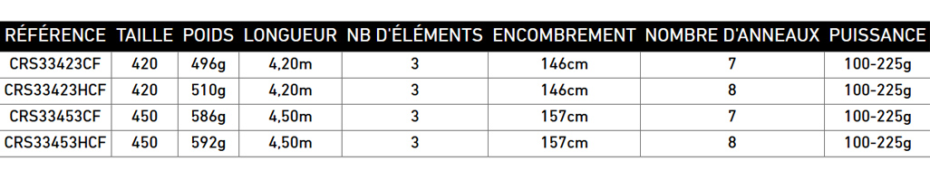 Lunghezza: da 420 a 450 cm • Potenza da 100 a 225 gr • Innesti: 3 fili • Blank Carbonio Alto Modulo