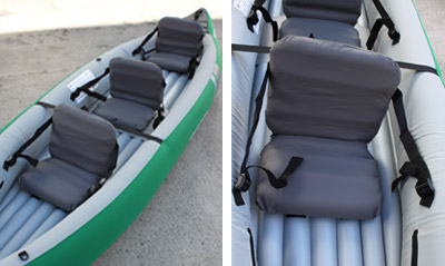3 sedili con schienale alto sono forniti con la canoa, tenuti in posizione da cinghie. Il sedile è gonfiabile e offre un maggiore comfort e una posizione più alta rispetto a fondo. Ci sono chiusura a strappo sul lato inferiore di sedili e sul fondo del kayak, in modo da poterli spostare in avanti o indietro per adattarsi alle dimensioni del passeggero o al numero di passeggeri.