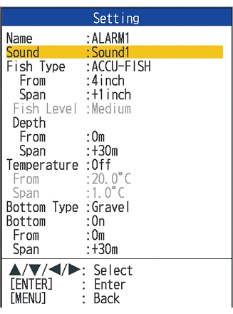 quando gli echi di pesce entrano nell'area definita, suona l'allarme (bip) e lampeggia un'icona nell'angolo in alto a destra dello schermo. Inoltre, è possibile impostare un'impostazione di allarme per impostare i parametri selezionati come: profondità dell'acqua o obiettivi, temperatura dell'acqua, natura del fondo, ecc.