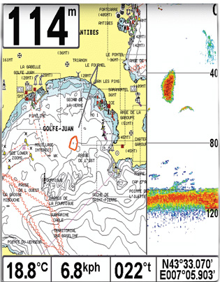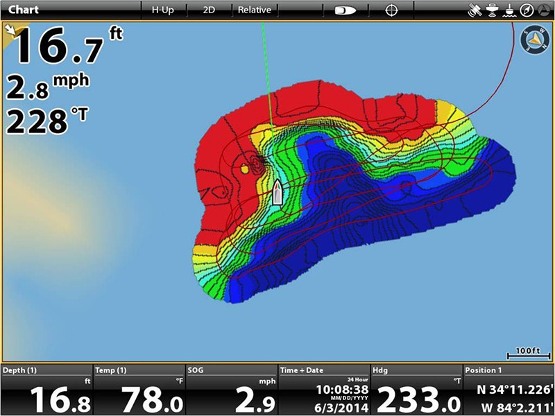 Crea mappe in tempo reale dei tuoi luoghi di pesca. Traccia i profili di profondità , la durezza del fondo e la vegetazione mentre guidi la tua barca, con otto ore di registrazione integrata.