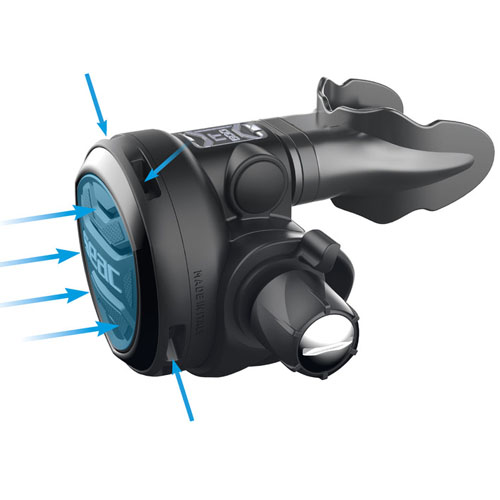 La regolazione "pre-immersione" permette di regolare con precisione lo sforzo respiratorio e di ottimizzare l'effetto Venturi, eliminando così qualsiasi rischio di flusso continuo, sia che l'erogatore o sia in bocca o meno.