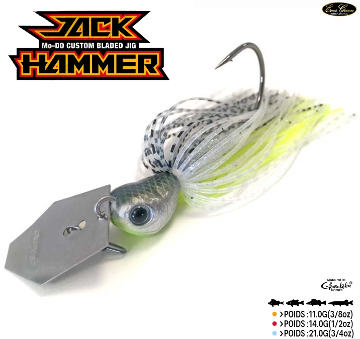 Il JACK HAMMER è probabilmente il miglior chatterbait sul mercato, ancora una volta, EVERGREEN ci ha informato.Le Chatterbaits sono estremamente popolari in tutto l'Atlantico e il JACK HAMMER è diventato immediatamente IL riferimento, il JACK HAMMER è stato progettato da Brett Hite stesso, soprannominato "Bladed Jig Master".
