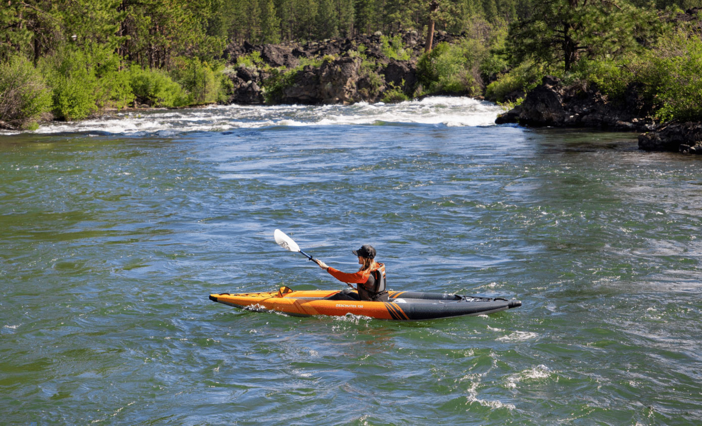 La linea Deschutes comprende tre modelli di kayak con un nuovo telaio innovativo. I kayak sono costruiti con camere principali in PVC rinforzato con tessuto Duratex e una schiuma EVA non rimovibile e non gonfiabile fondo. Le traverse gonfiabili integrate garantiscono la stabilità strutturale. Il risultato è un kayak molto facile da gonfiare (due camere principali e traversa), più leggero (niente fondo separato), molto facile da asciugare e più compatto. Altre caratteristiche includono un pinna rimovibile, valvole Halkey-Roberts (adattatori in dotazione), pozzetto posteriore, sedile Core 2.0, maniglie sagomate, allacciatura elastica e fori di drenaggio.