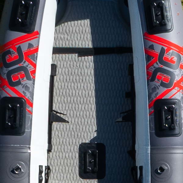 Il fondo e ad alta pressione in drop-stitch dell'Blackfoot e XF Angler 130 è uno dei suoi principali punti di forza. Questa tecnologia si basa su migliaia di filamenti interni che collegano le due pareti dell'fondo, consentendo un gonfiaggio ad alta pressione pur mantenendo una forma perfettamente piatta e tesa.