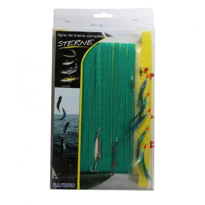 Montata su un avvolgilenze in schiuma galleggiante. Lunghezza totale: +/- 40 m. Composizione +/- 25 m di filo trecciato da pesca, 1 pater previsto per ricevere un piombo di circa 200 g (non fornito), 10 m di Nylon 60/100 dopo il pater, un girella anti-vrillage che collega il terminali in 50/100 composto da 5 esche artificiali a sgombri (amo da pesca N° 1/0), terminale di 2 m di Nylon in 50/100 con un cucchiaino pesca Flashmer Triplebar 20T (amo triplo N°4).