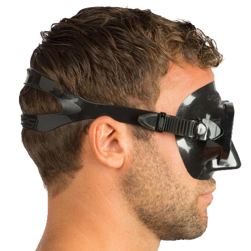Maschera per immersioni subacquee e snorkeling • Volume interno minimo: 130 cm³ • Profilo estremamente idrodinamico • Facciale in silicone morbido • Fibbie girevoli regolabili a 360°