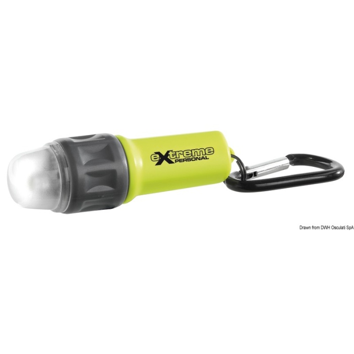 Può essere fissato al giubbotto di salvataggio con un moschettone o usato come piccola torcia elettrica.