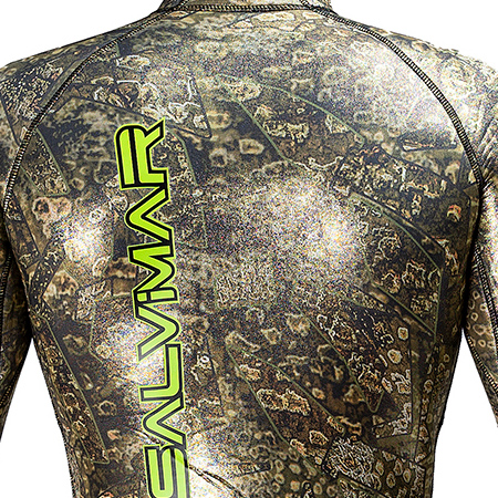 Muta da sub da snorkeling a due pezzi con fodera esterna in tessuto Krypsis 3D Spandex, tecnologia di sublimazione Camo con applicazione di squame trasparenti (Scales Effect) per riprodurre l'ambiente circostante (Scales Effect) per riprodurre l'ambiente circostante