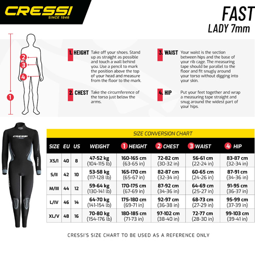 Muta subacquea donna - Neoprene 7 mm a doppio strato - Gambe preformate - Maniche in neoprene su entrambi i lati - Cerniera YKK sul retro con nastro impermeabile e sistema water-stop - Rinforzi elastici antiusura Tatex