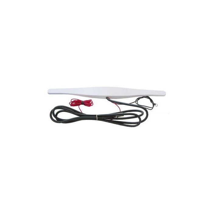 L'antenna è stampata in una custodia in ABS bianco di 32 cm di lunghezza x 3,2 cm di larghezza. Terminato da un connettore maschio RCA in ottone cromato e da un cavo coassiale da 75 ohms lungo 150 cm. Alimentazione 12Vdc tramite 2 cavi contrassegnati: rosso per il 12Vdc con una lunghezza di 150 cm e un filo nero terlminato da un occhiello con una lunghezza di 50 cm.