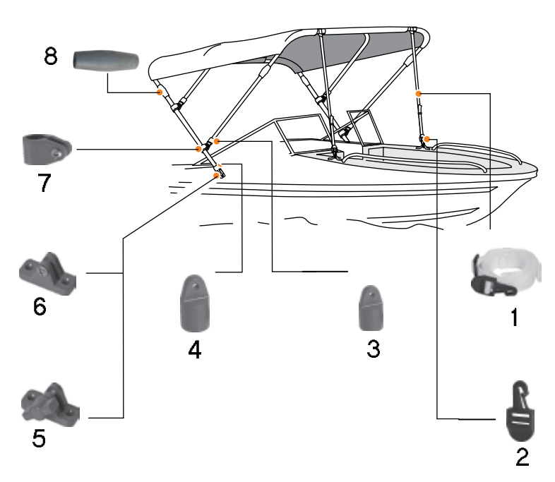 Diversi pezzi di ricambio per la sostituzione del vostro bimini.
