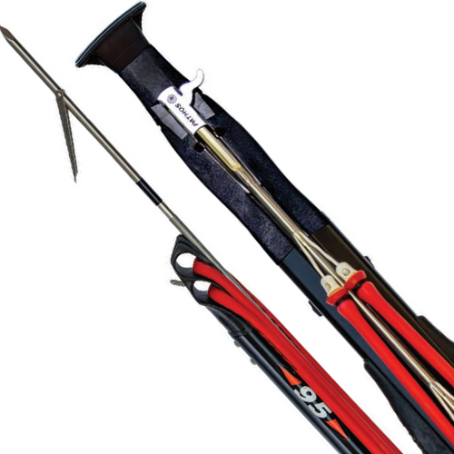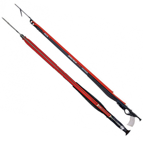 Fusto alluminio per osso di seppia • Testa roller • Asta in acciaio inox Ø 7 mm con pinnette • 2 Elastici arbalete TNT Red da 16 mm • Senza mulinello • Fucile subacqueo