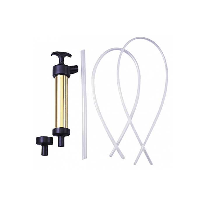 Pompa a siringa in ottone con guarnizioni e tubi, per svuotare il motore in modo pulito.