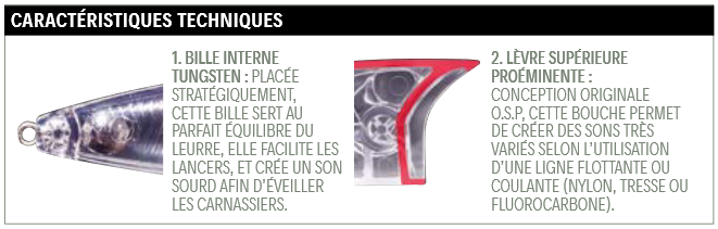 Quando è ferma, l'esca è quasi verticale e solo la testa sporge per mostrare il suo magnifico manto ai predatori. Il triplo dorso è impreziosito da piume e Flashabou per dare vita a LOUDER durante le pause.