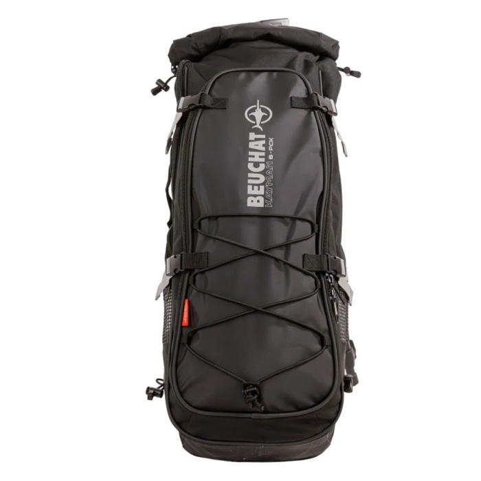 Volume : 38 à 56 L • Compartiment frontal isotherme • Sac à dos pour palmes longues • Accroche arbalètes pour deux fusils .
