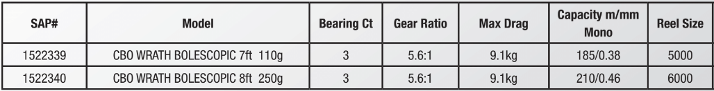 I set PENN Wrath Bolescopic sono disponibili in due versioni diverse; una versione più leggera 7ft (213cm) che può essere utilizzata con pesi fino a 110g e una versione 8ft (244cm) fino a 250g.