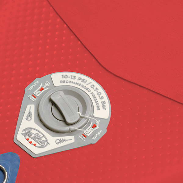 Uno schema sul bordo della valvola mostra come usare il pulsante per gonfiare o sgonfiare l'tavola. Indica anche la pressione massima consigliata per il gonfiaggio.