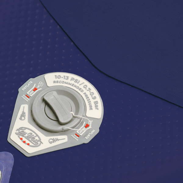 Uno schema sul bordo della valvola mostra come usare il pulsante per gonfiare o sgonfiare l'tavola. Indica anche la pressione massima di gonfiaggio consigliata.