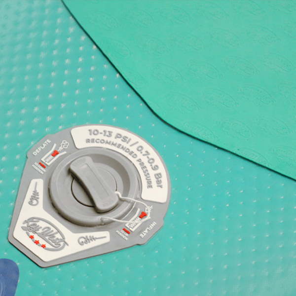 Uno schema sul bordo della valvola mostra come usare il pulsante per gonfiare o sgonfiare l'tavola. Indica anche la pressione massima di gonfiaggio consigliata.