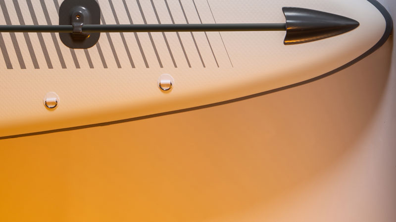 Il secondo strato di PVC viene termofuso al primo strato e stirato. La fibra unidirezionale, visibile sulla struttura, viene inserita tra i due strati. Questa tecnologia riduce il peso di sup di 2 kg rispetto a tutti i suoi concorrenti.