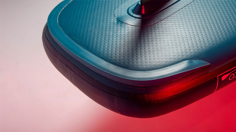 Il secondo strato di PVC viene termofuso al primo strato e stirato. La fibra unidirezionale, visibile sulla struttura, viene inserita tra i due strati. Questa tecnologia riduce il peso di sup di 2 kg rispetto a tutti i suoi concorrenti.