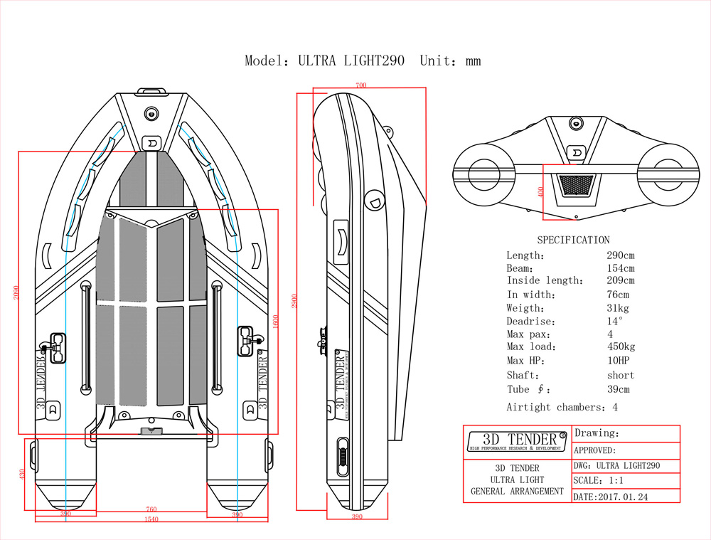 Tender gommone semirigido fondo in alluminio • lunghezza 2,90 metri • larghezza 1,54 metri • per 4 passeggeri • peso 31 kg.