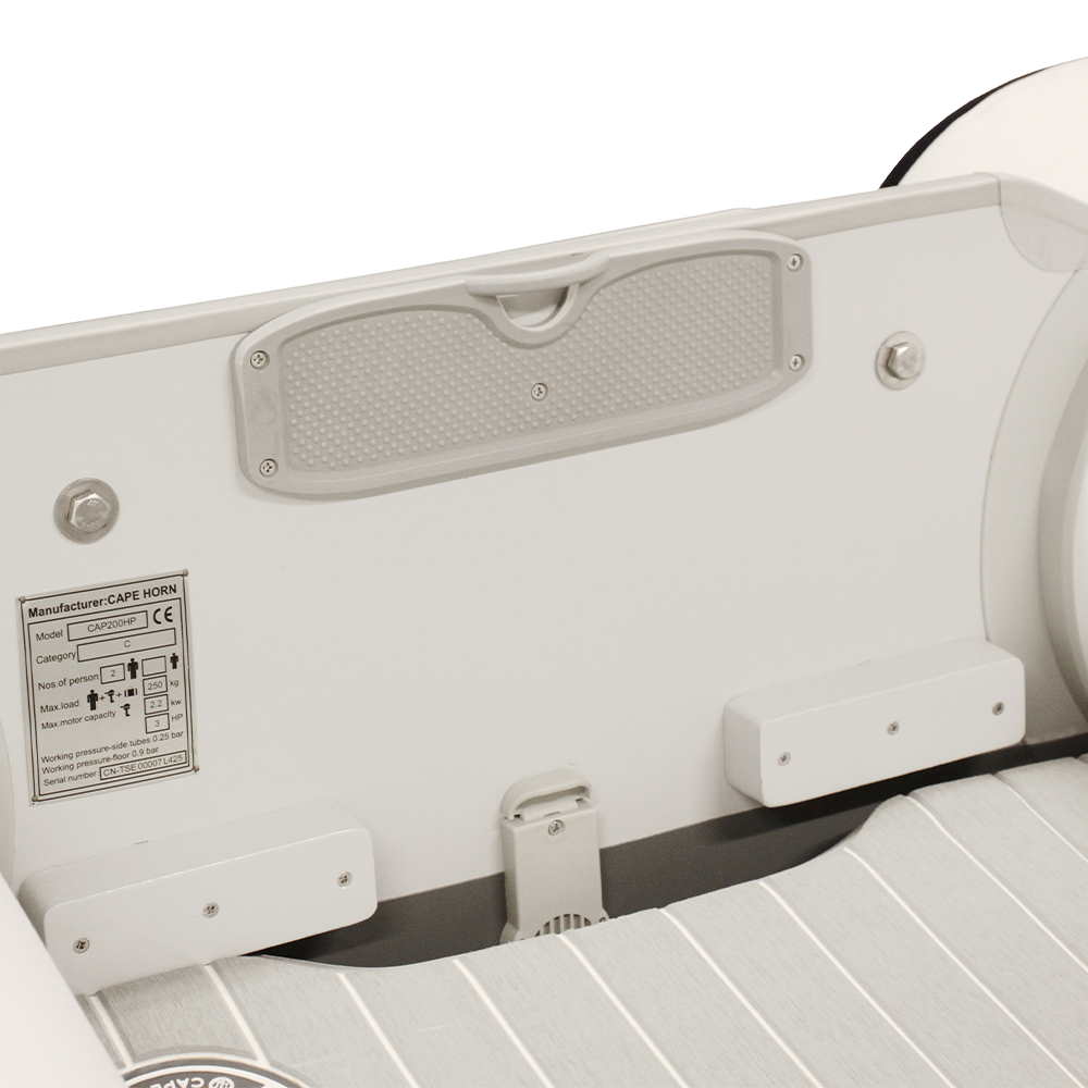 Il tender gommone Cape Horn Cloud Grey ha una robusta listello di protezione che lo rende più resistente e a prova di urti. Posizionato sul bordo dei galleggianti, questo listello è fondamentale durante gli attracchi, perché assorbe gli sfregamenti e gli urti contro banchine, pontili o altre imbarcazioni.